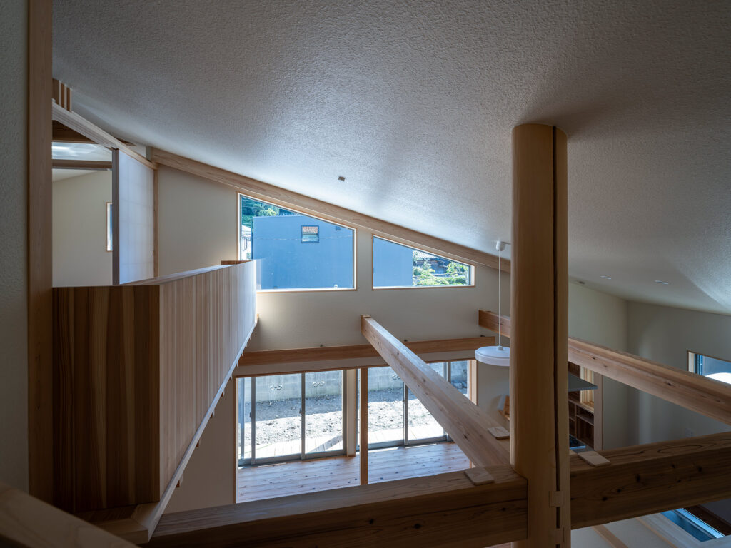 リビングでゆったりとくつろぐひととき、ふと目線を上げると、大屋根の軒下に設けた台形のFIX窓から、青空と桜山の緑がまるで絵画のように切り取られます。