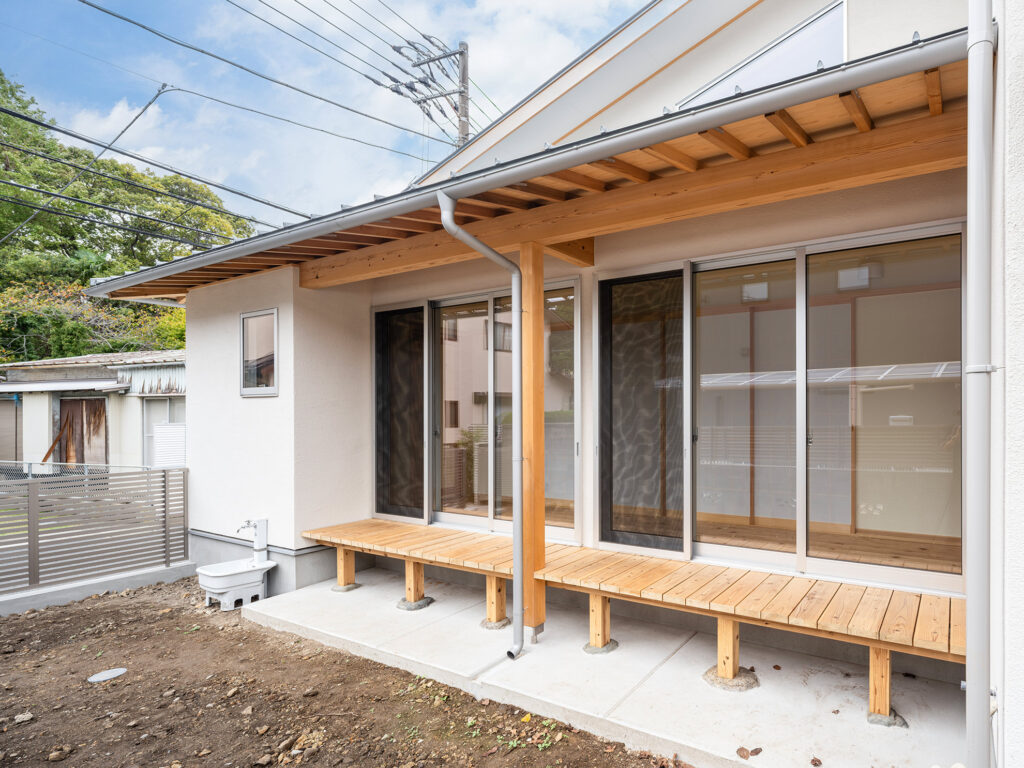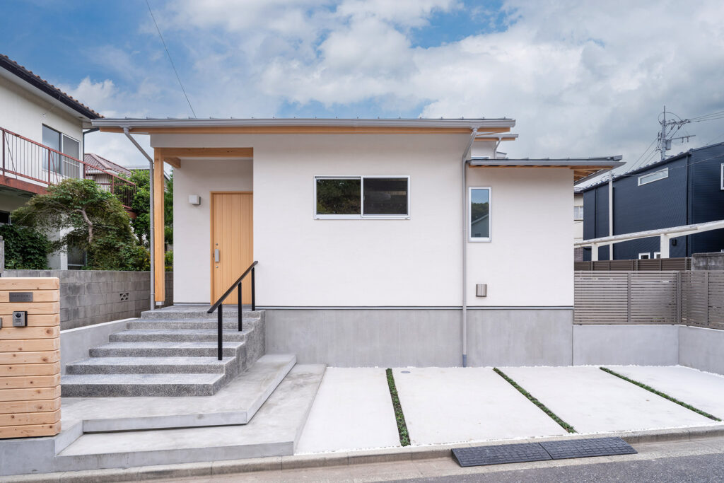 逗子・葉山の町並みに溶け込む、濡れ縁と下屋庇を備えた白壁の和の邸宅。