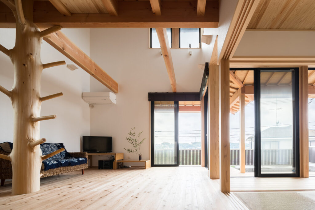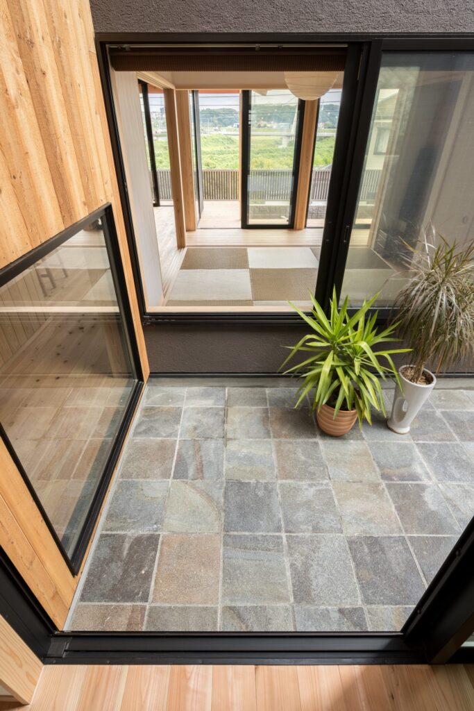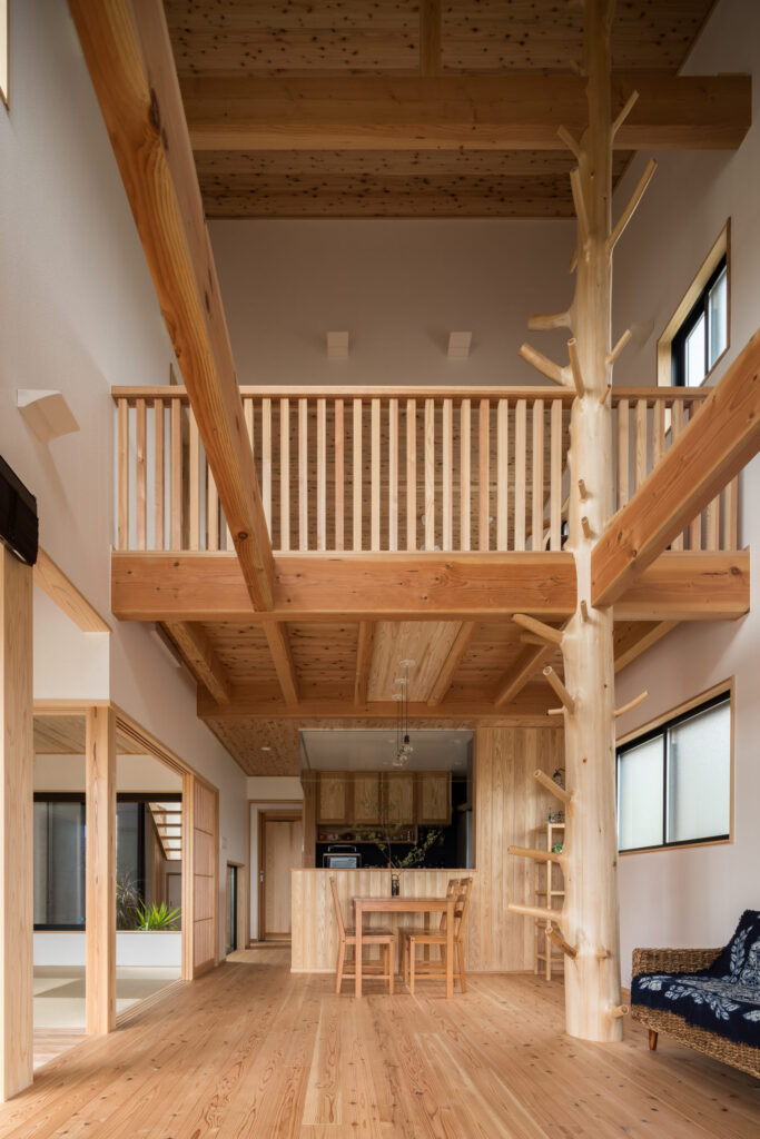 遊び心たっぷりの枝つき通し柱や鉄平石を敷き詰めた中庭など